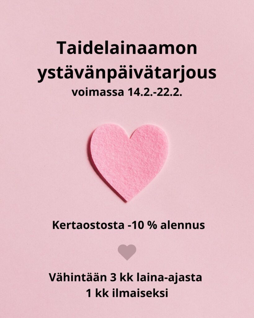 Julkaistu 11.2.202611.2.2026 tehnyt Lahden Taidelainaamo Ystävänpäivätarjous 14.-22.2.2026 Artikkelien selausEdellinen artikkeli Loppuvuoden aukioloajatSeuraava artikkeli: Pääsiäisen 2026 aukioloajat